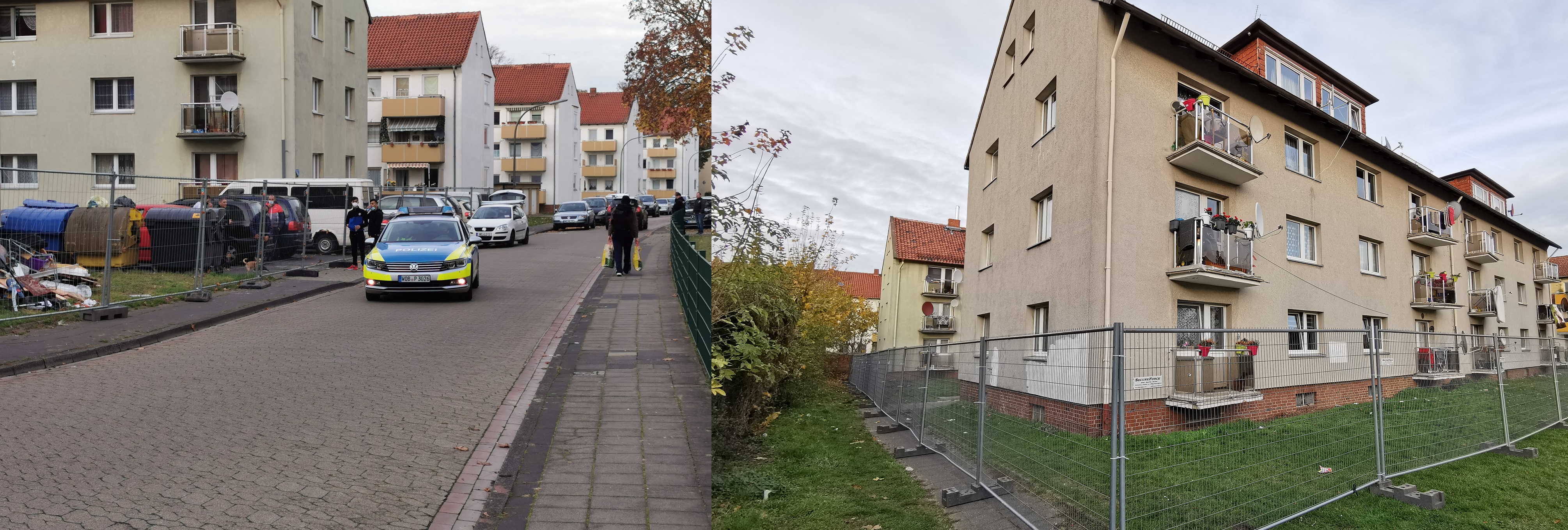 Samstag, 14. November 2020Helmstedts schönste und gesündeste Straße - der Dammgarten![]() Der Dammgarten in Helmstedt. Eine sich mit rot gepflasterten Steinen an Mehrfamilienhäusern vorbeischlängelnde Straße am Rande von Helmstedt. Vielen Einheimischen bekannt als ein sozialer Brennpunkt mit einem Müllproblem. Die sommerlichen Abende werden lautstark von Feiern begleitet und über Nacht wachsen die Haufen neben den Häusern bestehend aus Hausmüll und Sperrmüll. Die Schüsseln zum Fernsehempfang prägen das Bild eines jeden Balkons. Eine schöne Idylle sieht anders aus. Die Anwohner fühlen sich massivst gestört und stehen hilflos dar. Auf der Webseite "https://markuslenz-online.de/dammgarten/" wird durch einen Anwohner schon seit Längerem per Text und Bild dokumentiert, was es für Probleme mit den Nachbarwohnblöcken gibt. Unzählige Bilder zeigen immer wieder anders aussehende Sperrmüllberge, Lagerfeuer und große feiernde Menschengruppen. In der Nacht auf den 14.11.2020 rückten Polizei, Feuerwehr und THW im Dammgarten an. Sie umzäunten die beiden Problemblöcke samt Autos komplett mit einem Bauzaun. Im Vorfeld gab es hier am Freitag bereits 8 bestätigte Corona-Fälle. Insgesamt rund 40 Personen wurden getestet, allerdings werden die noch ausstehenden Ergebnisse erst am Montag erwartet. Zahlreiche Bilder und Videos kursierten in den sozialen Netzwerken. Am Samstag Mittag sieht es in der Straße nur fast so aus wie immer. Die Wohnblöcke stehen noch und die Müllberge liegen lustlos daneben. Alles hinter einem Bauzaun ohne Durchkommen. An der Straße und an allen Ecken beobachtet ein privater Sicherheitsdienst, dass auch bloß Niemand versucht den abgeriegelten Quadranten zu verlassen. Zwischen beiden Häusern an der Straße stehen die Autos - ebenfalls hinter dem Zaun. Dort tummeln sich auf beiden Seiten des Zaunes fremdsprachige Mitbürger. Ohne Maske und ohne Sicherheitsabstand. Es wird laut gesprochen und gelacht. Der Hund muss mal auf den Wiese und wird in Mitten des Geschehens ausgeführt. Eine Einkaufstasche wird mit Einkäufen an einem Seil in das Dachgeschoss gezogen und von einer orientalisch aussehenden Frau durch ein Fenster hineingenommen. Anwohner schauen sich das Spektakel an und auch die Polizei fährt verstärkt durch den Dammgarten. Nach einer Familienfeier gab es einen Corona-Ausbruch und nicht alle Bewohner waren einsichtig auch zu Hause zu bleiben. Zwei junge Freunde aus der Friedrichstraße und Böttcherstraße sind auch auf dem Gehweg unterwegs und kaufen für Ihre "Freunde" ein. Ein 10 Euro Schein wird durch den Zaun gesteckt - beide machen sich auf den Weg zum angrenzenden Discounter. Der Jugendliche in einer altmodischen BMW-Trainingsjacke mit Logo auf der Brust erzählt mir in sehr gebrochenem Deutsch, dass die Absperrung für alle ohne Vorwarnung gekommen sei. Sie müssen einkaufen gehen, da niemand das Grundsück verlassen dürfe. Viele die dort wohnen haben nur 160 Euro im Monat zum Leben. Eine Versorgung durch die Kommune scheint es nicht zu geben - ob das stimmt? Die Wohnung wird bezahlt. Man fragt sich wer einen Gebäudekomplex sich so herunterwohnen lässt und damit lebt die Immobilienpreise des eigenen Betongoldes so in den Keller rauschen zu lassen. Offenbar ist nur eines wichtig: Monatlich pünktlich und sicher das Geld von den Behörden für die auf Sozialleistungen angewiesenen Bewohner zu kassieren. Da grinst auf der einen Seite die hässliche Fratze des rücksichtslosen Kapitalismus und auf der anderen Seite sieht man Armut und Leid - Menschen die versuchen das Beste aus ihrer Lage zu machen. Ohne Integration und gelockt mit Sozialleistungen werden sie hier förmlich sich selbst überlassen. Wohnen 3.0 in Deutschland.