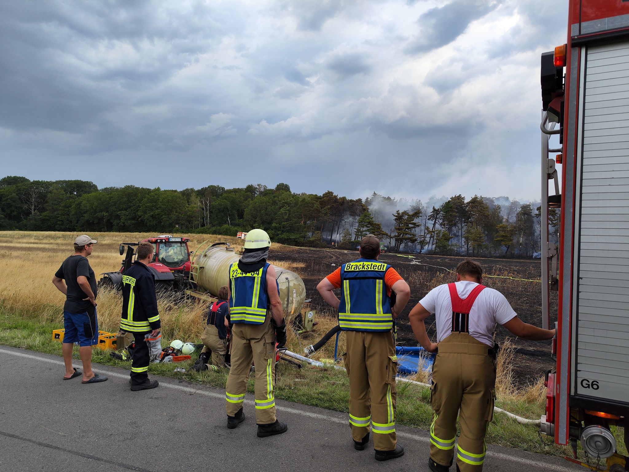 Am heutigen späten Nachmittag brach auf einem trockenen Feld zwischen Lauingen, Scheppau und Rieseberg ein Flächenbrand aus. Auf Grund der Windrichtung breitete sich das Feuer schnell Richtung Waldrand aus und wurde in den Wald getragen. Die alarmierten Feuerwehren bauten schnell eine Wasserversorgung durch Tanklöschfahrzeuge und später auch durch helfende Landwirte aus dem Umkreis auf. Letztere mobilisierten ihre Tankanhänger und brachten ebenfalls Wasser.